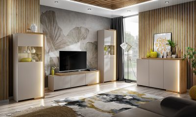 Material | Body: Melamined chipboard 16mm - kaszmir/28mm oak grand natural, edging PVC; Fronts: melamined chipboard 16mm - kaszmir; edge PVC, hinge: soft close, glass front: 4 mm tempered glass |